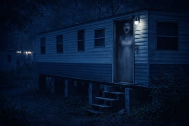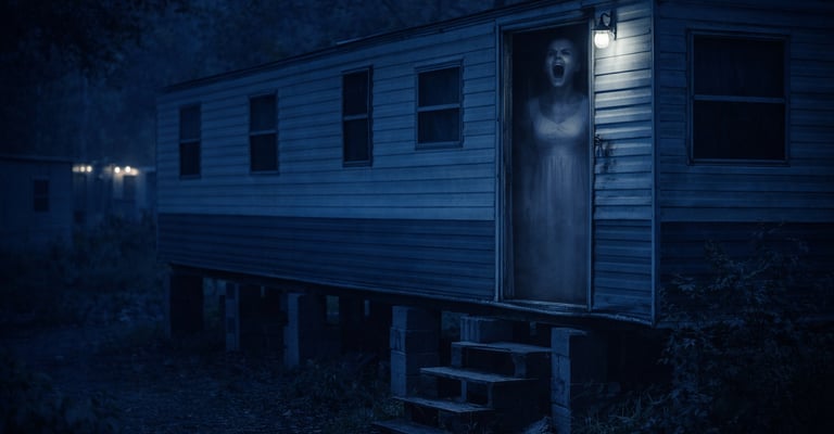 They say the screaming woman in the doorway is the restless spirit of a young woman murdered by her jealous boyfriend, forever reliving her final moments in this trailer under the cover of night